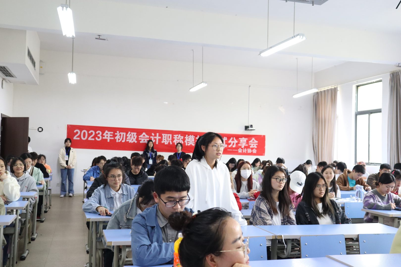 本次活动分为初级会计职称模拟考试和学习分享会。模拟考试采取笔试的方式进行,以《初级会计实务》、《经济法基础》为参考,尽可能为同学们还原初级会计职称考试氛围。此外,在模拟考试后举办学习经验分享会,该会由已经取得初级会计职称证书的同学分享备考心得以及复习方法。各位同学在会上积极提出备考时遇到的困难,大家共同思考解决办法,使同学们及时调整备考状态,更好面对正式考试。