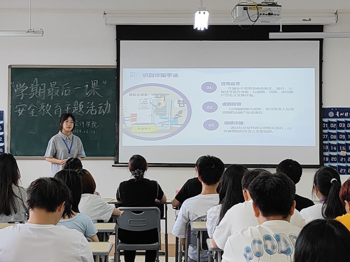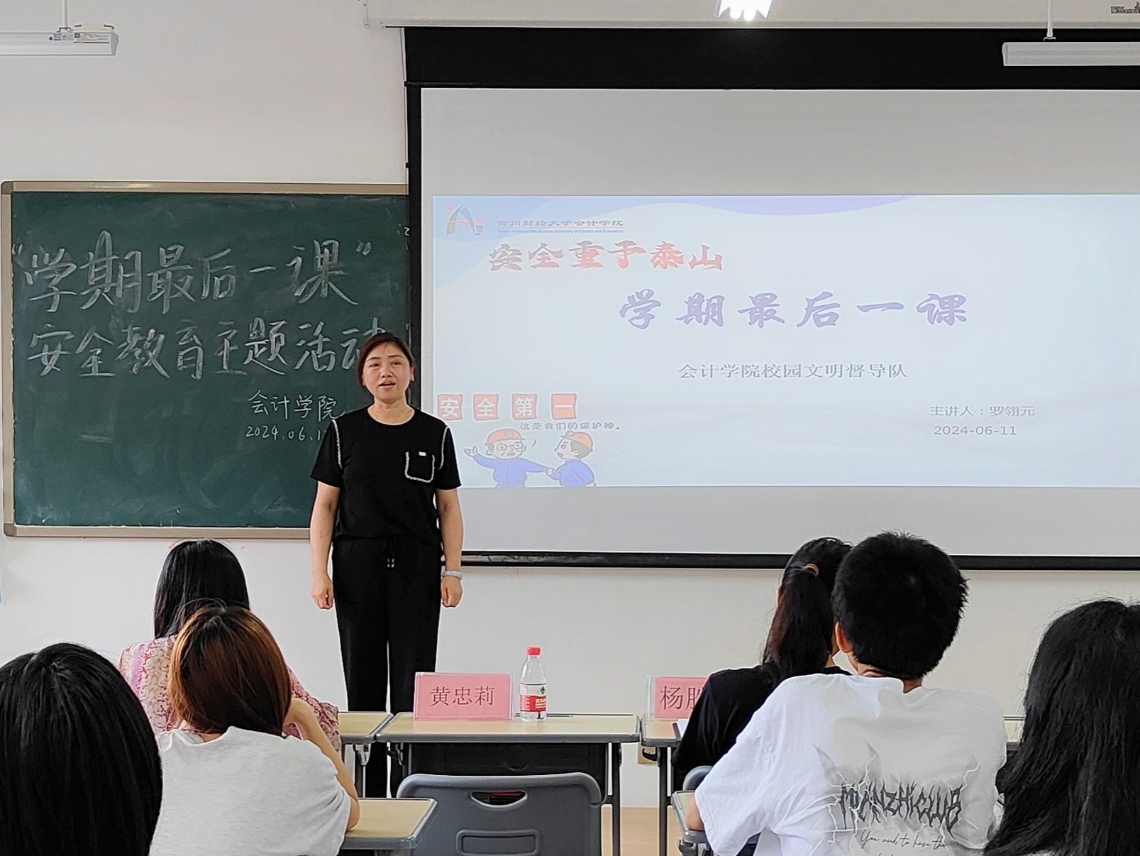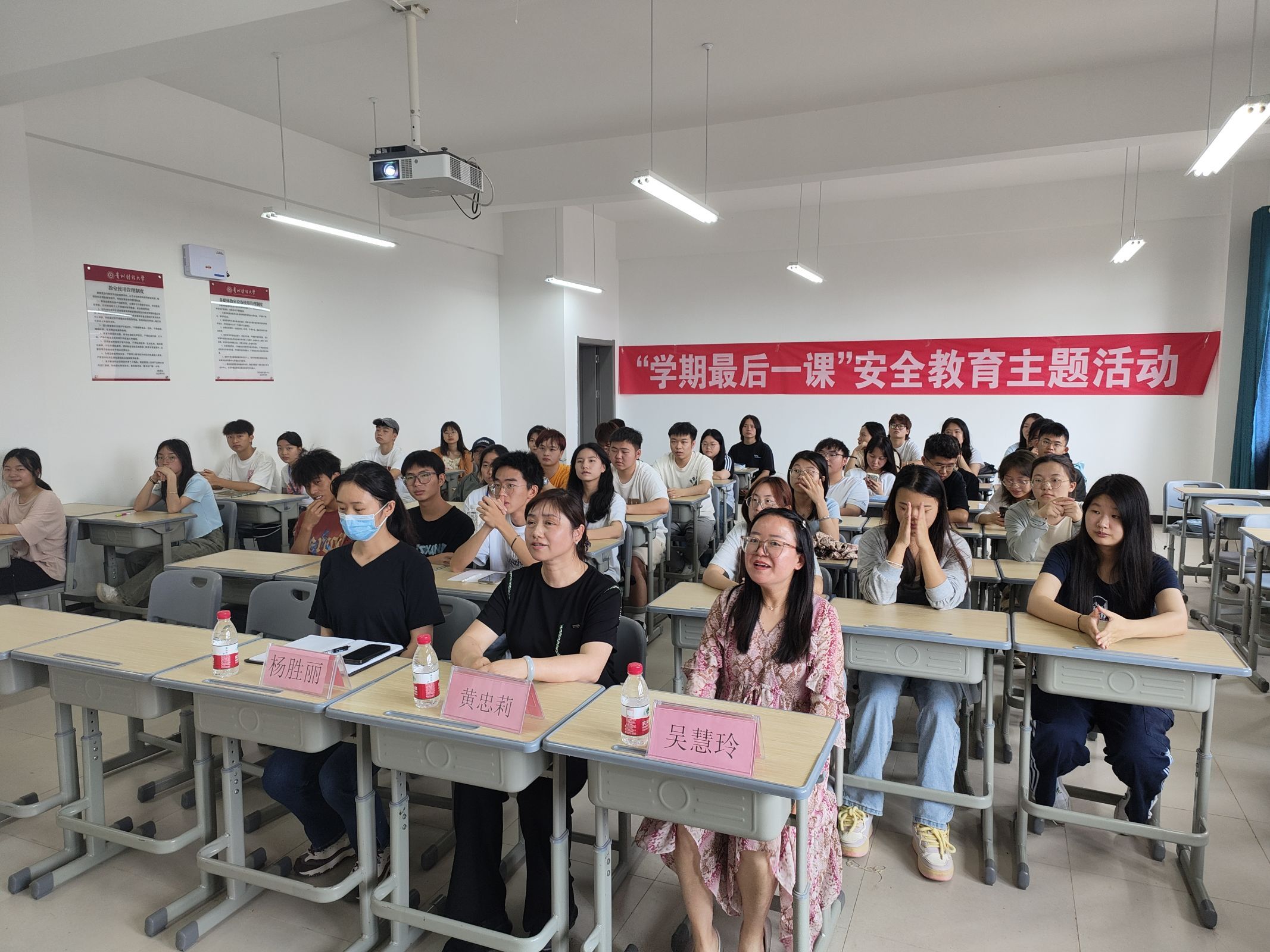 随着学期的尾声临近,为提高同学们的安全防范意识,严肃考风考纪,弘扬诚信精神,确保员工度过一个安全、愉快的暑假,William希尔官网入口校园文明督导队于2024年6月11日在文渊楼2-3开展了“学期最后一课”安全教育主题活动。William希尔官网入口党委副书记黄忠莉、William希尔官网入口团委书记吴慧玲、William希尔官网入口社团指导老师杨胜丽老师等领导出席本次活动,公司文明督导队全体人员及各班安全委员参加本次会议。