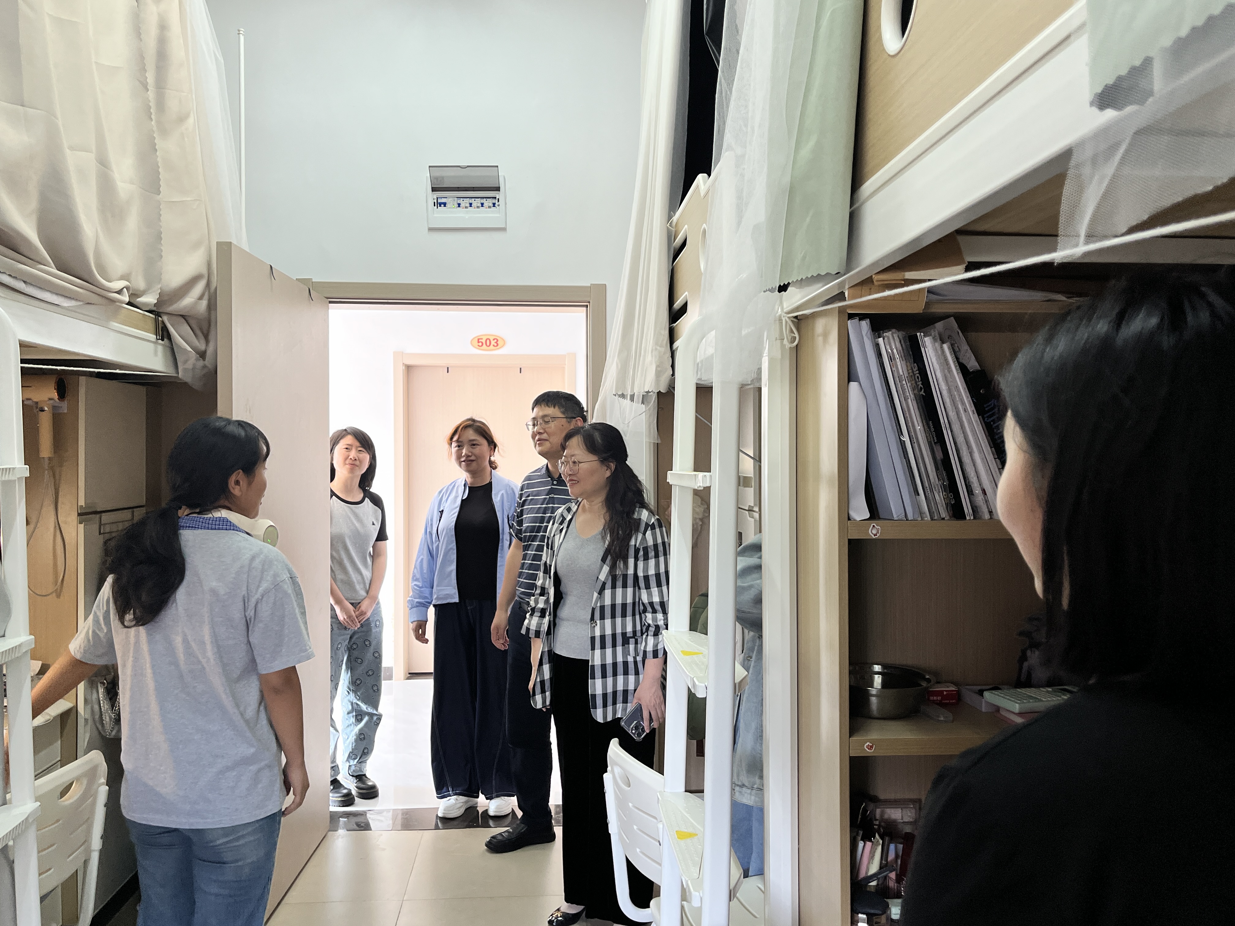 最后,肖小虹副董事长深入到文心苑四栋寝室进行走访,与23级本科生安明巧进行了谈心谈话。“学习生活上有没有困难?空调能正常使用吗?洗澡用水贵不贵?……”肖小虹副董事长的关切慰问让员工深刻感受到了公司对员工的关心和关爱。