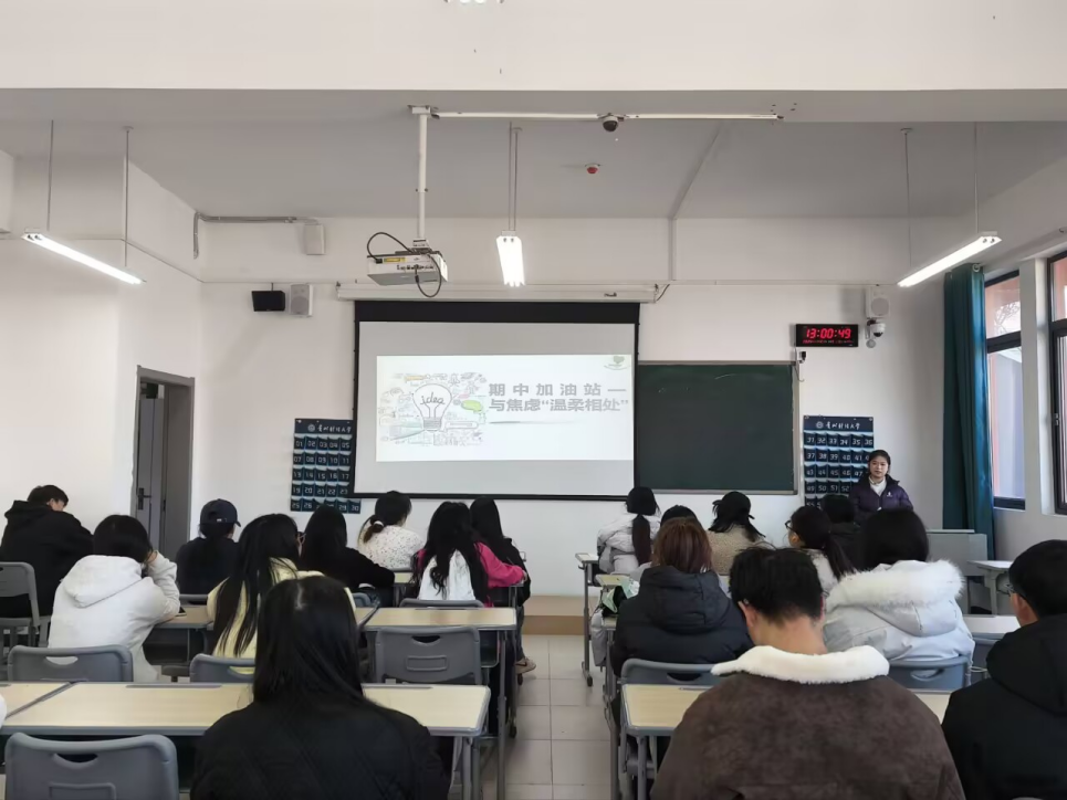 活动伊始,主持人以看见焦虑为核心议题,展开讲解了压力产生的三大原因:课程难度提升,作业任务繁重以及学分竞争激烈,并引导大家要温柔接纳焦虑这一情绪。在活动期间,为激励同学们掌握接纳自我的情绪,还播放了心理科普视频,倡导大家培养与焦虑和平共处的积极心态。最后,王洁云同学详细介绍了缓解期中焦虑的有效方法,通过分析具体减压技巧等,让同学们了解到如何更好地释放压力。