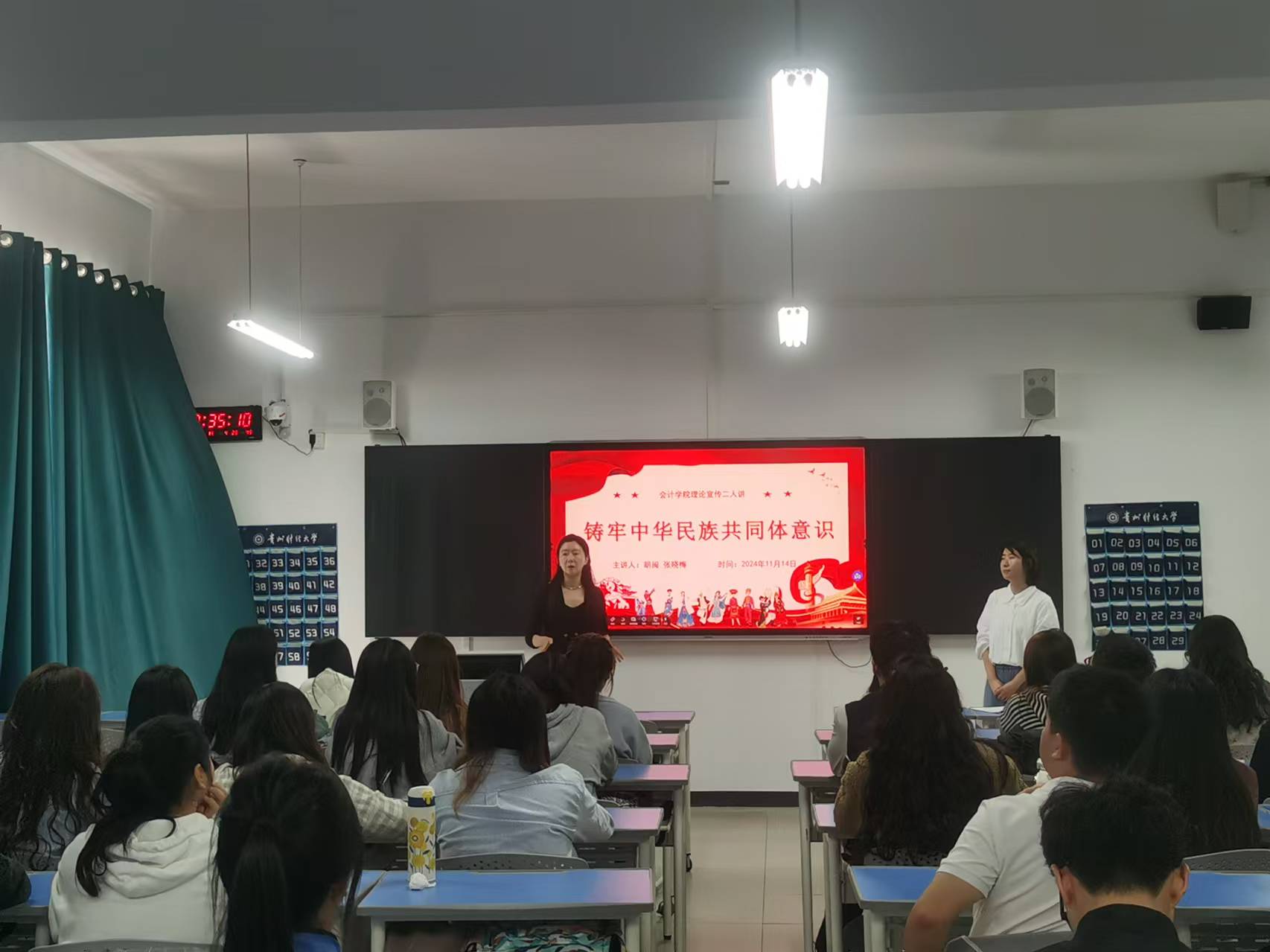 11月14日,William希尔官网入口党委副书记胡闽、辅导员张晓梅在文渊楼4-2教室为员工党员开展了“铸牢中华民族共同体意识”理论宣传二人讲活动。