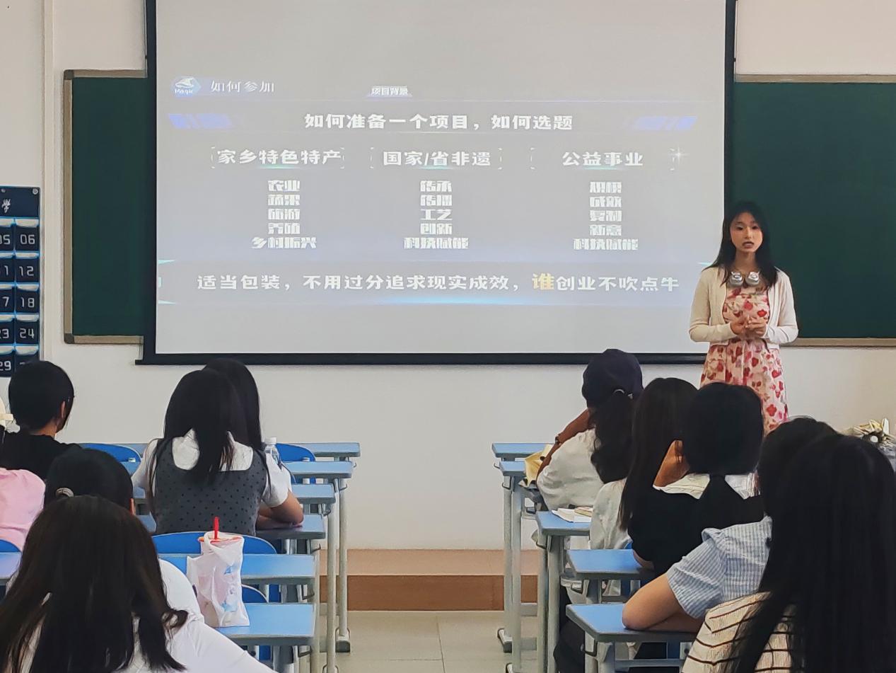 活动中鲁梦易同学先向同学们展示了她在创新创业大赛取得的成绩,又从员工的角度将创新创业大赛分为八个方面向同学们逐一介绍。从曾经的创业小白,到如今的“校园之星”,鲁梦易同学曾经遇到的问题也是同学们将会遇到的问题,她向同学们介绍了创新创业大赛最重要的一个部分——选题,分析各个类型的选题的利与弊,帮助同学们找到更合适的选题。鲁梦易同学还向同学们分享了“筠之声”和“天籁知音”这两个她参与的项目。她从身边的人和事入手,用不同的角度为寻常的事物找到了新的解决办法,也让同学们对创新创业大赛的选题有了新的灵感。