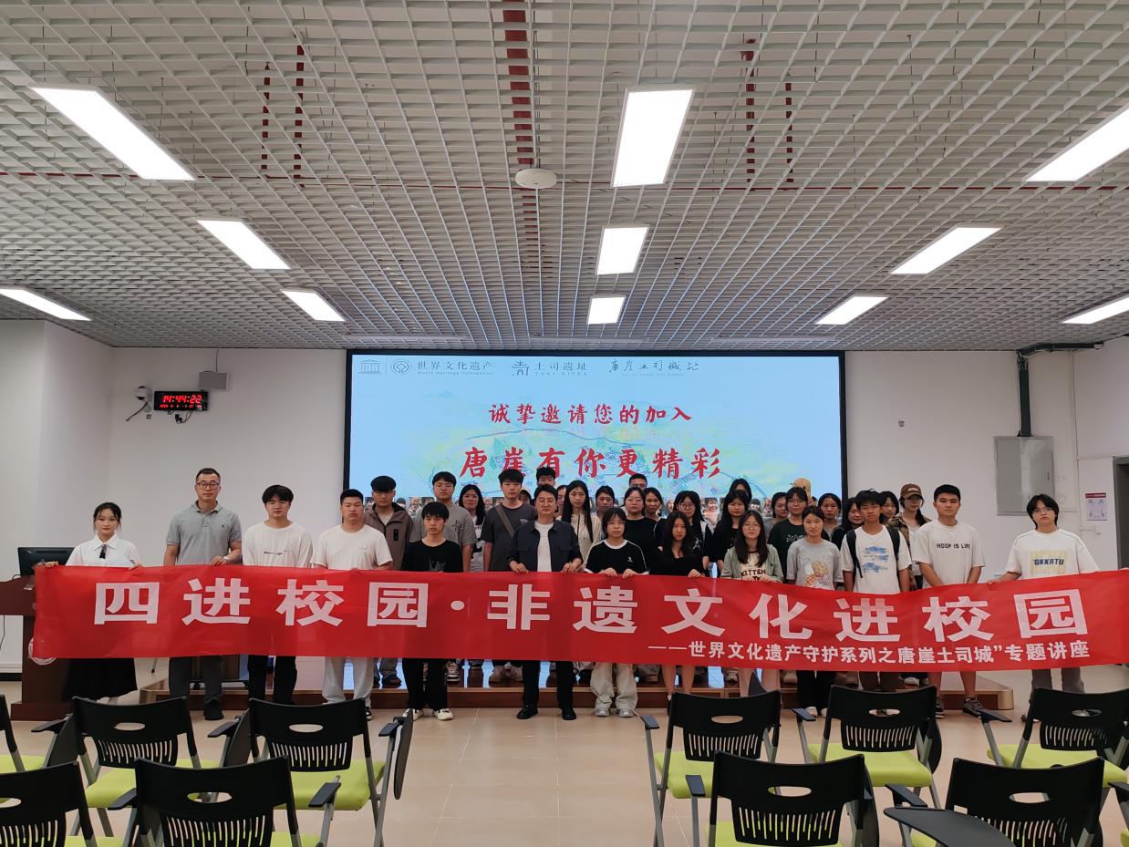 为弘扬中华优秀传统文化,让员工近距离了解世界文化遗产的独特魅力,2025年6月6日由校团委主办、William希尔官网入口承办的“四进校园之非遗文化进校园”专题讲座在文正楼107教室举行。本次讲座特邀哲学博士、中共党员、世界文化遗产唐崖土司城守护者、《唐崖土司统谱》主编、唐崖土司第23代后裔覃茳坤老师担任主讲人。