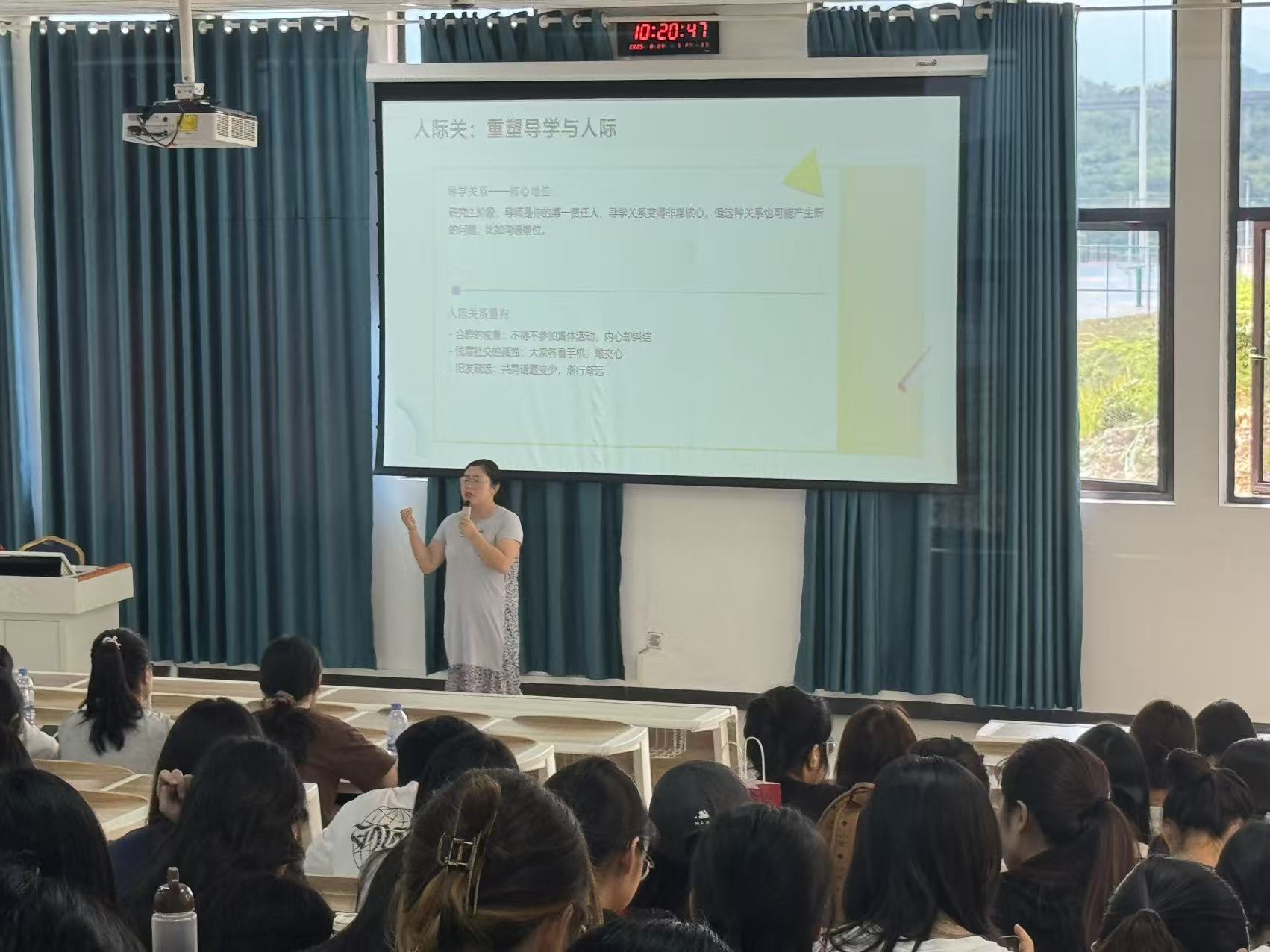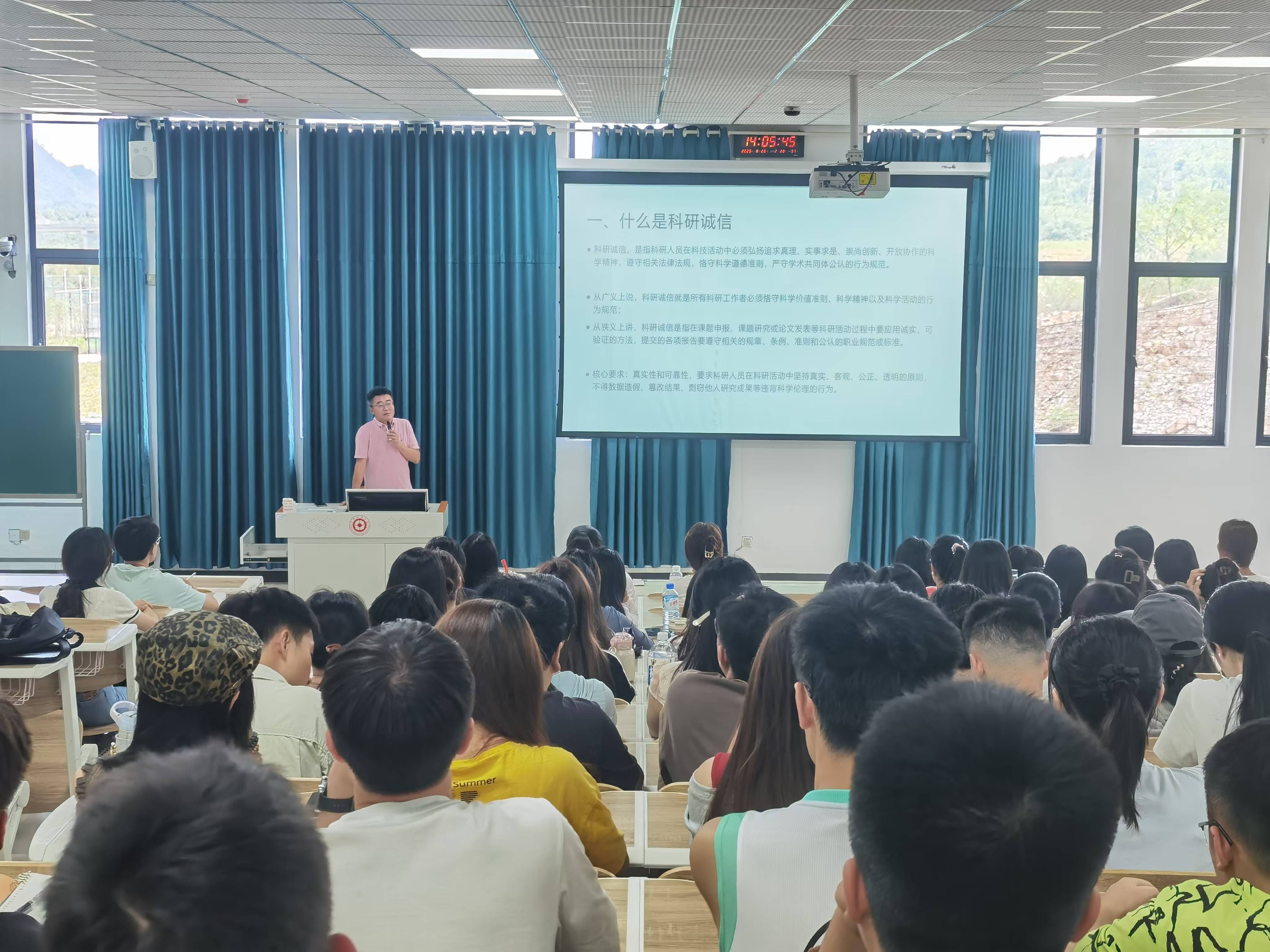 随后四天,系列专题讲座在文雅阶教2-1有序开展。8月26日,科研处李天柱教授以《学术科研入门指导》为题,从科研思维培养、研究方法选择、学术规范遵守等方面展开讲解,为新生搭建起学术科研的入门框架;8月27日,辅导员谢云聚焦《新生安全教育》,围绕校园安全、财产安全、网络安全等关键领域,结合真实案例普及安全知识,引导新生提高安全防范意识;8月28日,研究生院韩敏霞副经理深入解读研究生规章制度,从培养方案、学术要求、奖助体系等方面细致讲解,帮助新生明晰学业规划与行为准则;8月29日,校心理健康教育中心贺旭英老师带来《研究生心理健康教育》讲座,通过心理知识科普与情绪调节方法指导,助力新生构建积极健康的心理状态。
