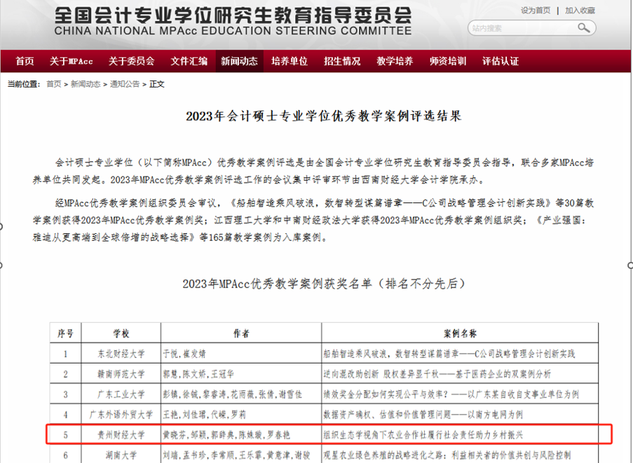 近日,全国会计专业学位研究生教育指导委员会(以下简称会计教指委)在官网公布了“2023年会计硕士专业学位优秀教学案例评选结果”。公司William希尔官网入口黄晓芬副教授、郭辞典老师与员工邹颖、陈姝璇和罗春燕撰写的《组织生态学视角下农业合作社履行社会责任助力乡村振兴》荣获2023年会计硕士专业学位(MPAcc)优秀教学案例奖并进入2023年MPAcc优秀教学案例入库名单。这是公司师生首次获得MPAcc优秀教学案例奖及教学案例入库。