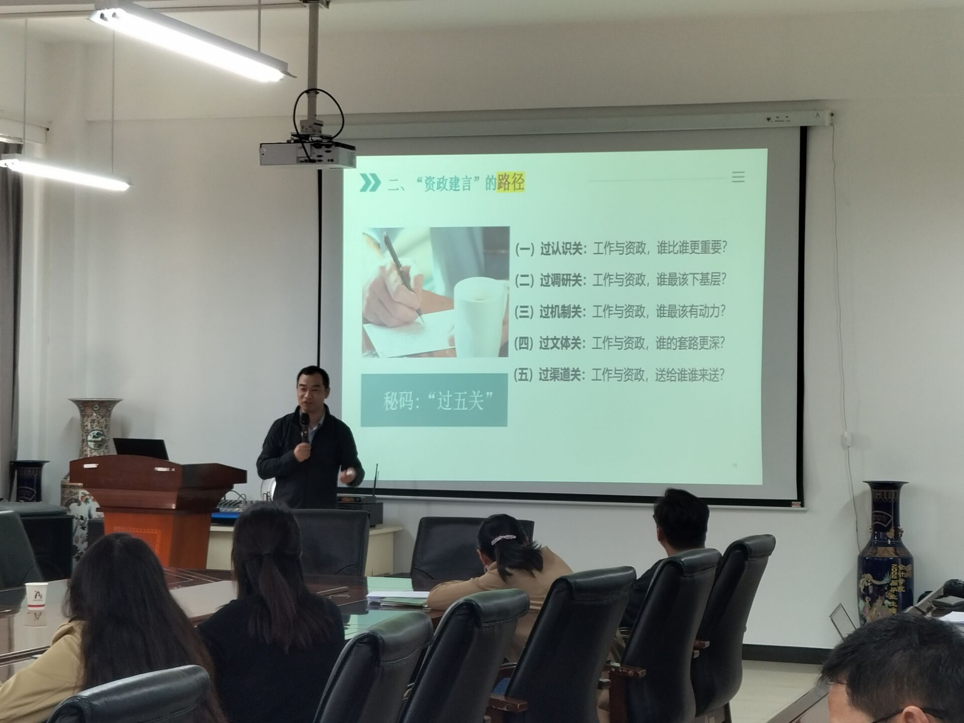 讲座伊始,潘文富副教授强调了调查研究和智力资源在国家发展中的重要性,随后详细介绍了资政考核指标,包括国家社科基金项目免于鉴定结项的条件,成果获得省部级以上奖项、领导批示或被重要刊物采用等都是考核的重要方面。