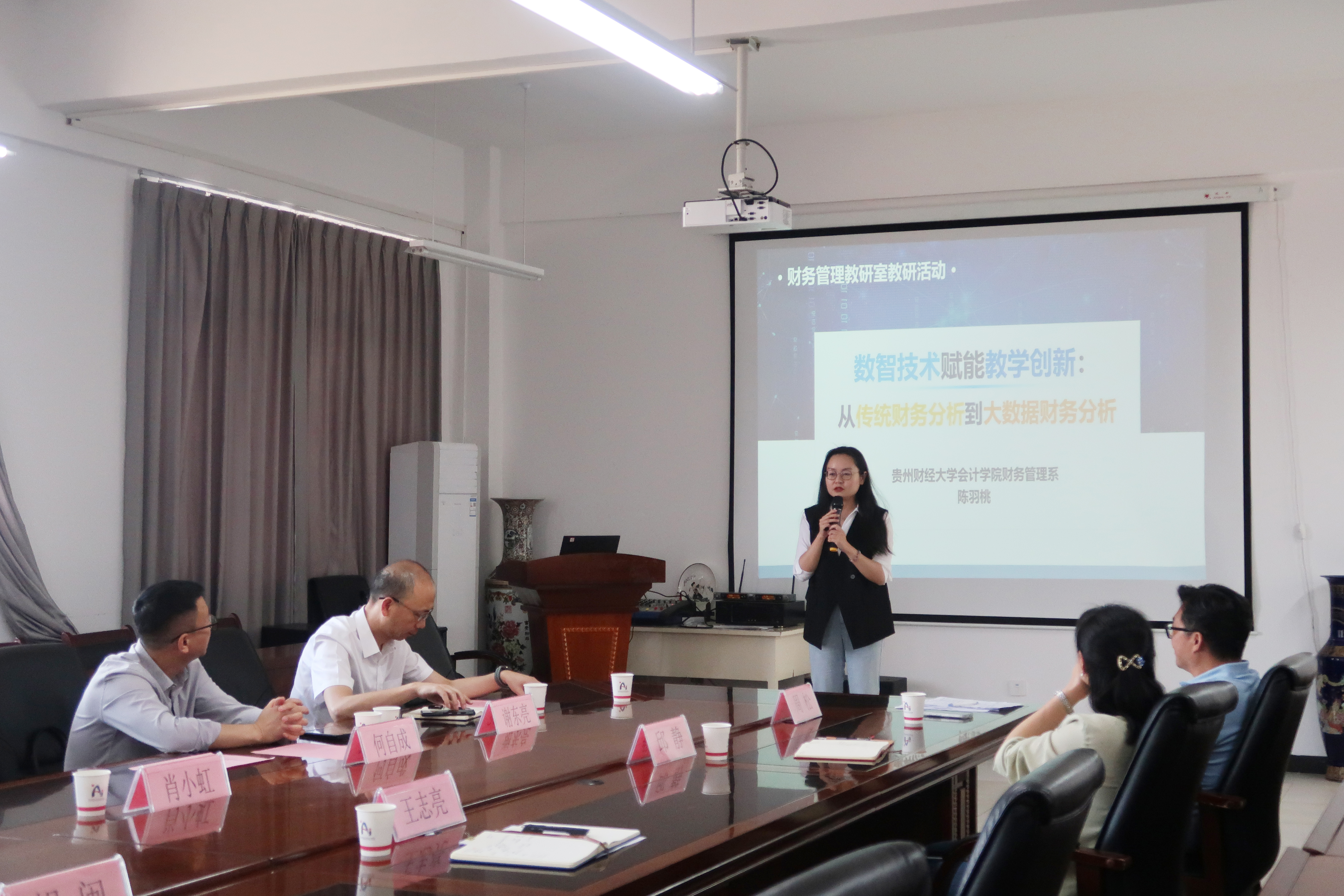 随后会计系系主任陈羽桃老师围绕《数值技术赋能教学创新:从传统财务分析到大数据财务分析》作了讨论发言,以财务分析课程教学为切入点,详细阐述如何从科学设计课程思政体系、推进课程体系数智化转型、基于BOPPPS模型创新教学模式以及实施多元化课程考核方式四个方面进行课程建设。