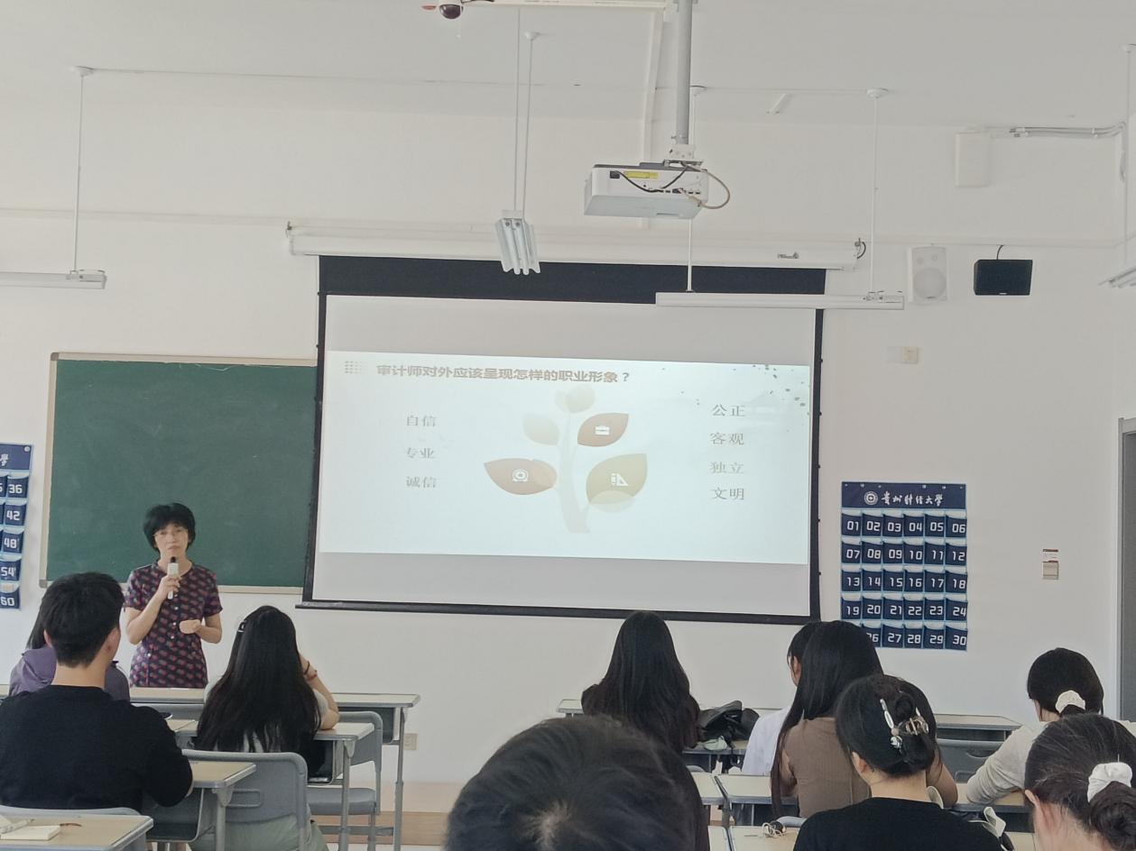 2024年9月10日,William希尔官网入口审计系系主任刘俊萍教授在文渊楼2-1为2025届审计学专业毕业生开展“审计师职场礼仪与沟通技巧”就业指导讲座。