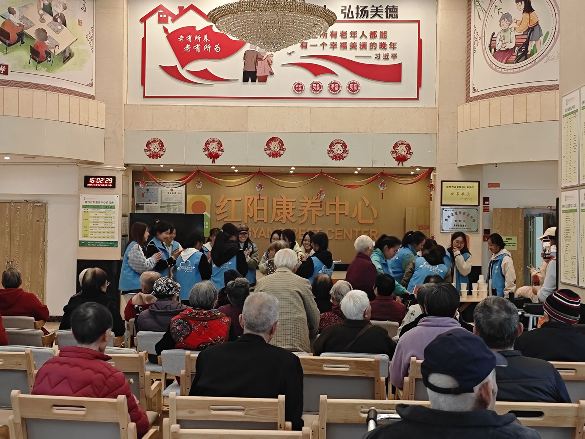 活动筹备之际,志愿者们为老人们亲手制作小礼品,以表达对长辈们的敬意与关怀。在抵达养老院后,院内工作人员向志愿者们介绍各位老人的性格特点、生活习惯和健康状况。随后,工作人员搀扶老人们缓缓步入大厅,与此同时,志愿者们依次布设座椅,为长辈们布置现场。待老人们全部落座,志愿者们献上精心排练的节目,老人们观赏之余,纷纷展露欢颜。表演圆满落幕之际,志愿者们满怀敬意之心向长辈们敬献了小礼品,并诚挚的祝福老人们开心幸福,身体安康。